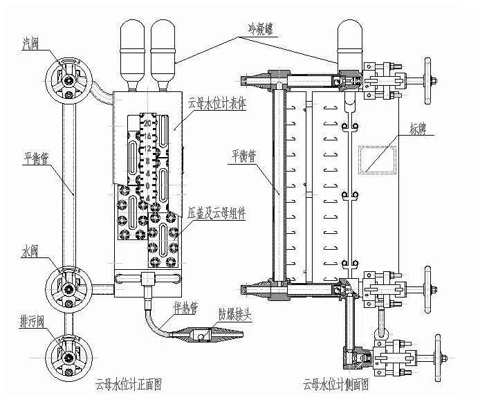 封头上布置有人孔门,安全阀管座 6 只,左右各 3 只,4 对水位监视用管座,用于接 2 只就地双色云母水位计和 2 只水位平衡容器。封头还设有一只连续排污管座、炉水取样管座和试验管座。